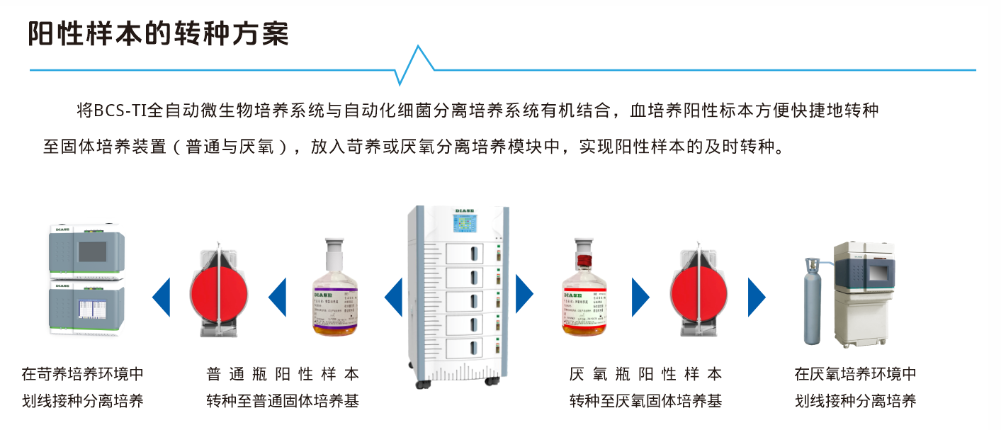 完整的血液培養(yǎng)理念 完整的血液培養(yǎng)涵蓋血液樣本的增菌培養(yǎng)及陽性樣本在固體培養(yǎng)基上完成的分離培養(yǎng)兩部分。 全自動(dòng)微生物培養(yǎng)系統(tǒng)對培養(yǎng)瓶進(jìn)行增菌培養(yǎng),并采用國際先進(jìn)的CO2直測技術(shù),敏感而快捷地對培養(yǎng)瓶內(nèi)CO2濃 度進(jìn)行直接感應(yīng)與監(jiān)測,結(jié)合科學(xué)的算法模型,及時(shí)、快速、準(zhǔn)確地報(bào)告陽性結(jié)果。 對于陽性血液培養(yǎng)瓶,普通瓶轉(zhuǎn)種至普通固體培養(yǎng)基上,在苛養(yǎng)環(huán)境中完成劃線接種與分離培養(yǎng);厭氧瓶轉(zhuǎn)種至厭 氧專用固體培養(yǎng)基上,在厭氧環(huán)境中完成劃線接種與厭氧分離培養(yǎng)。